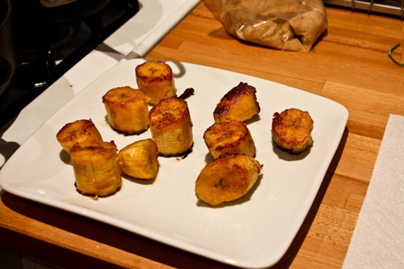 If you ever want to get a bit more adventurous, try a savory plantain dish called “tostones”. Use green plantains and do the same thing you guys did tonight with the ripe ones: fry once, smash, fry again, sprinkle with salt and eat. You’d love them!!