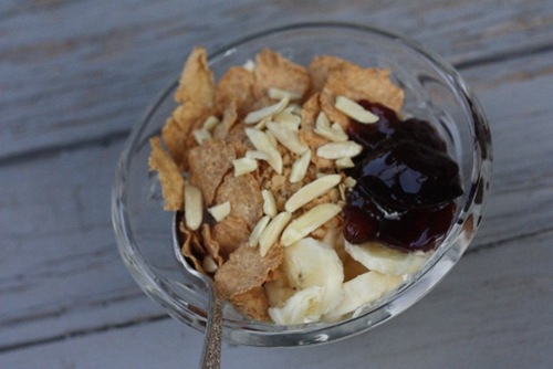 I made a parfait with banana, Wheaties, Opera Girl Granola, homemade plum jam, slivered almonds