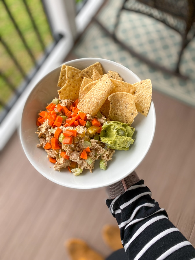 I made Thomas and myself a curried tuna salad for lunch, amped up with lots of chopped veggies. Plus some prepare guac and chips for scooping it all up.