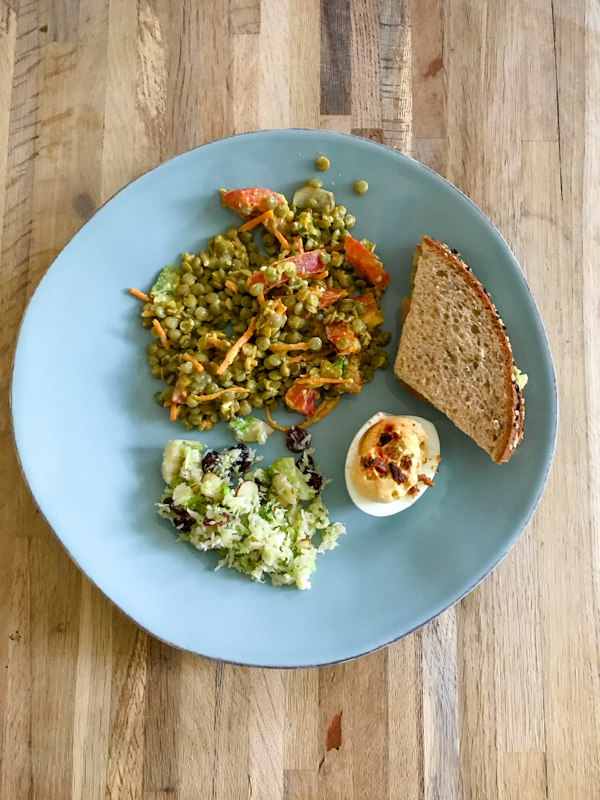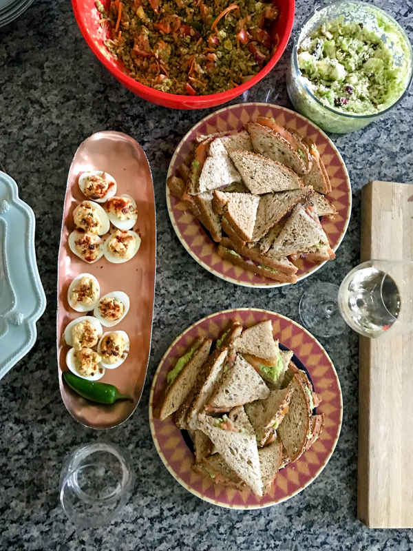 Moroccan lentil salad (amazing!), smoked salmon tea sandwiches, bacon deviled eggs, and brussels sprouts salad! Plus 4 kinds of wine *wide eye emoji*