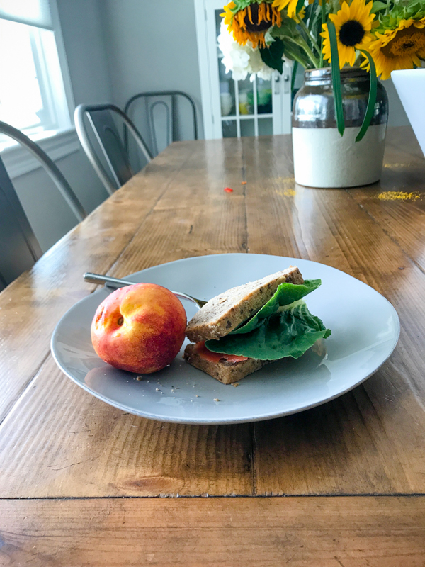 My main course was a smoked salmon, havarti and spinach half sandwich and a nectarine for dessert. (Note all the sunflower tears on the table!)