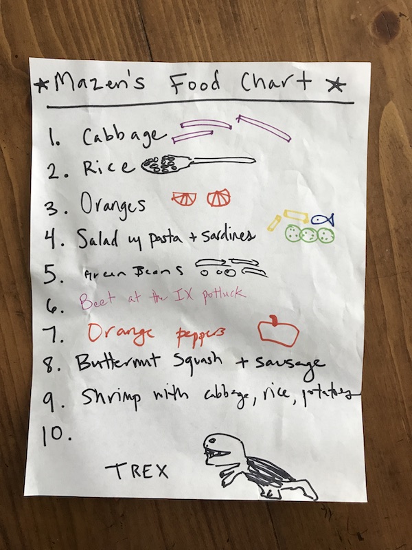 - Created a new foods chart. Mazen is very motivated by charts and lists, so we made a big chart on the fridge and talked it up. If he ate 10 new-to-him foods, we would take him to Toys R Us for a new toy (I got to set the budget and decide what counted as a new food). I have never seen my child so excited to eat cabbage, sardines, green beans, a beet, etc. He didn’t blink an eye. I also made a point of asking him how it tasted, and most of the time he said “good.”