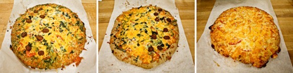We made two on hearty doughs – Dakota and Nine Grain – topped with pesto, tomatoes, peppers, cheese and half organic + local sausage and one just a cheese bomb on Cheddar Garlic dough that was insane!!