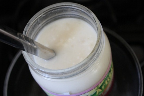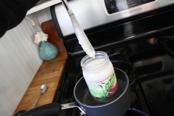 The texture of coconut butter is highly dependent on temperature of the room. In the summer it’s like a melting bowl of ice cream; in the winter it’s hard as wax. To make it useable, just heat it a bit. I used to microwave it, but since we don’t have one, I just put the whole jar in simmering water for a bit (this is probably a much better method anyways..)