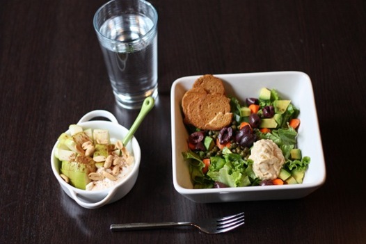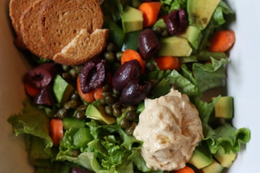I made a Greek salad – lettuce with olives, capers, avocado, hummus, carrot and some Melba toasts