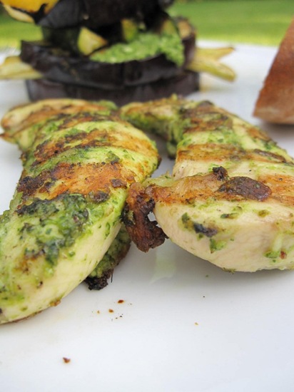 I bought a few grillable veggies on Sunday to have for tonight since I knew the weather would be nice, but we had no clue what to have with them. Iโm hosting my sister and her girlfriends for lunch tomorrow and decided on grilled chicken salads, so I picked up some chicken while running errands today. I have lab until noon and knew I couldnโt grill them tomorrow, so we grilled them tonight and made that part of dinner. When brainstorming seasoning, I remembered the cilantro in the veggie drawer: PESTO!