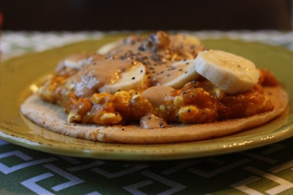 I made a 1/3 cup pancake portion (you just mix with water to activate) and topped it with a mixture of pumpkin (~1/3 a cup) and Organic Valley cottage cheese (~1/3 cup) and cinnamon, which I had heated in the microwave. Plus banana slices, chia seeds and a nice PB2 sauce spiked with a little Nuttzo!!