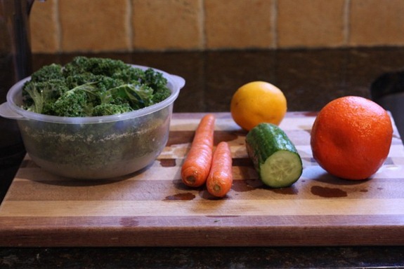Kale, carrot, cuc, lemon, tangelo. The one piece of fruit makes such a difference. I like juice with apple the best though 🙂