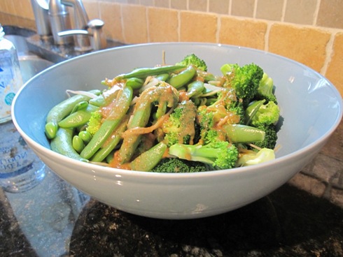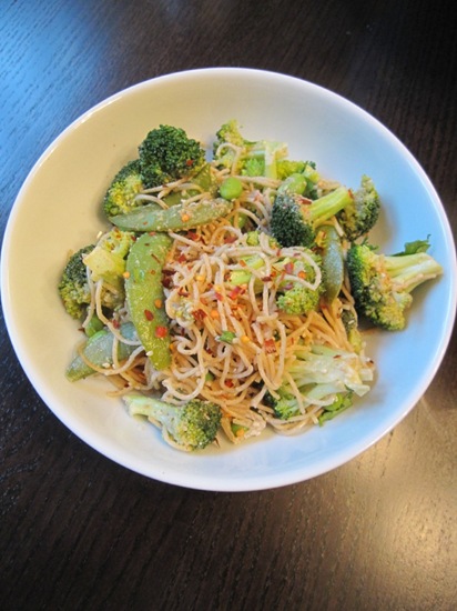 The cold noodle salad was great. I took about 4 ounces of whole wheat spaghetti (soba would have been awesome, but the last time I tried to buy it it was $5 a package compared to $2 for the WW pasta…) and tossed it cooked with broccoli (1 crown, fresh), edamame (1/2 cup frozen), and sugar snap peas (1.5 cups frozen). There was supposed to be bean sprouts too but they were brown and slimy when I got them out to add 🙁