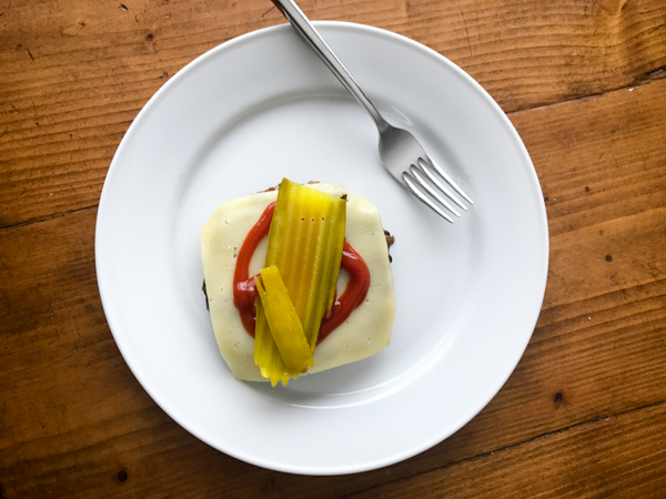 He stayed on with Matt to spend the afternoon together, and I biked home for lunch. I wasn’t too hungry, so I had a No Bull veggie burger with cheese, ketchup and pickle! I didn’t want to fill up with a bun, especially since I knew we were having beef burgers for dinner.