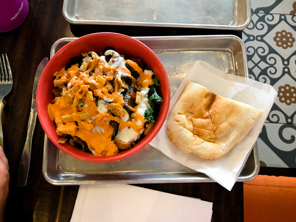 T went to play golf, and I took Mazen out to lunch at Mezeh. We shared a big bowl of falafel and chicken over pilaf and kale. I picked out the chicken and kale for him, and he had that with a pita.
