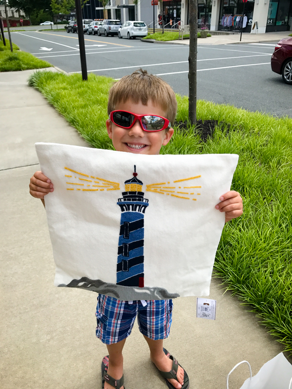 We popped into Pottery Barn. Who says boys don’t like shopping! We tried on lotions together, picked out our favorite beds, and perused the pillows. Mazen found this one, which he said was Bald Head’s lighthouse, and since it was on sale for $11 I bought it for him.