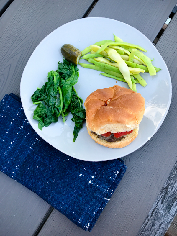 Sunday we had…..leftover burgers for dinner! Plus beans + greens from our garden!
