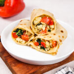 You’ll also find peppers and spinach in this recipe, but you can really use any veggies you have in your fridge – zucchini, kale, arugula, tomatoes. Just make sure they are small-diced so they’ll tuck into the burrito. Other ingredient variations include black beans, pinto beans, pesto, or salsa.