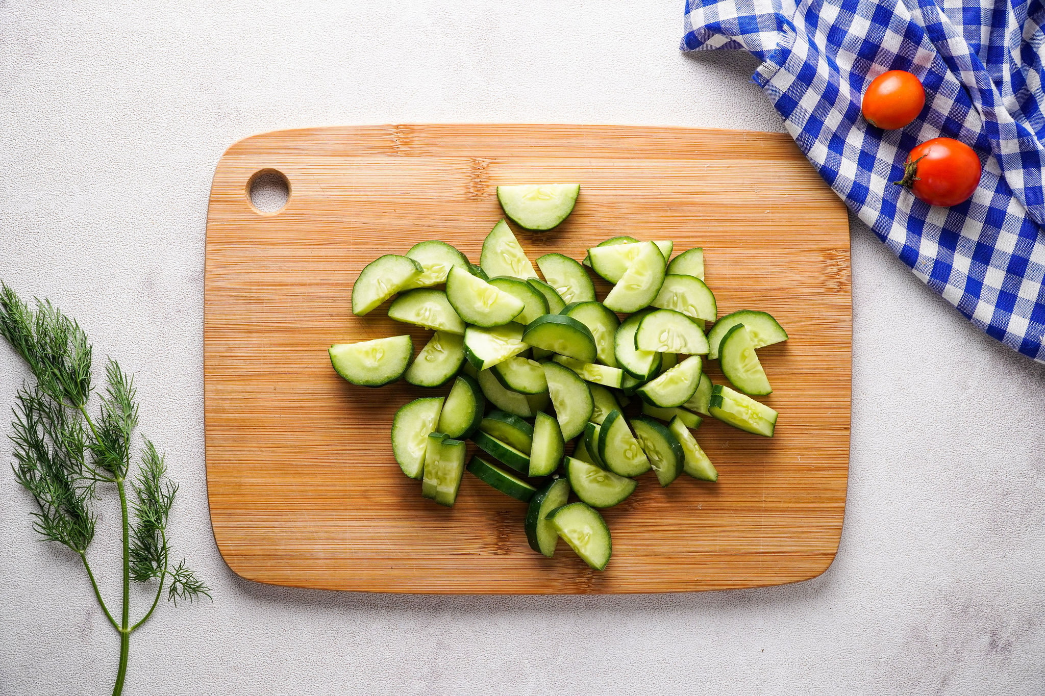 - Wash the cucumber, halve lengthwise, and cut it into slices ¼-inch thick. Do the same with the cherry tomatoes.