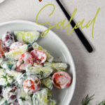 Have some cucumbers you need to use up? This creamy cucumber salad is the perfect summer salad to serve as a side dish for all your grilling occasions. Or as a dish on a potluck buffet! It’s also great as a filling for pita bread gyros with grilled chicken. With a sauce made of Greek yogurt, dill, and lemon, you’ll be able to highlight freshly picked summer cucumber and cherry tomatoes.