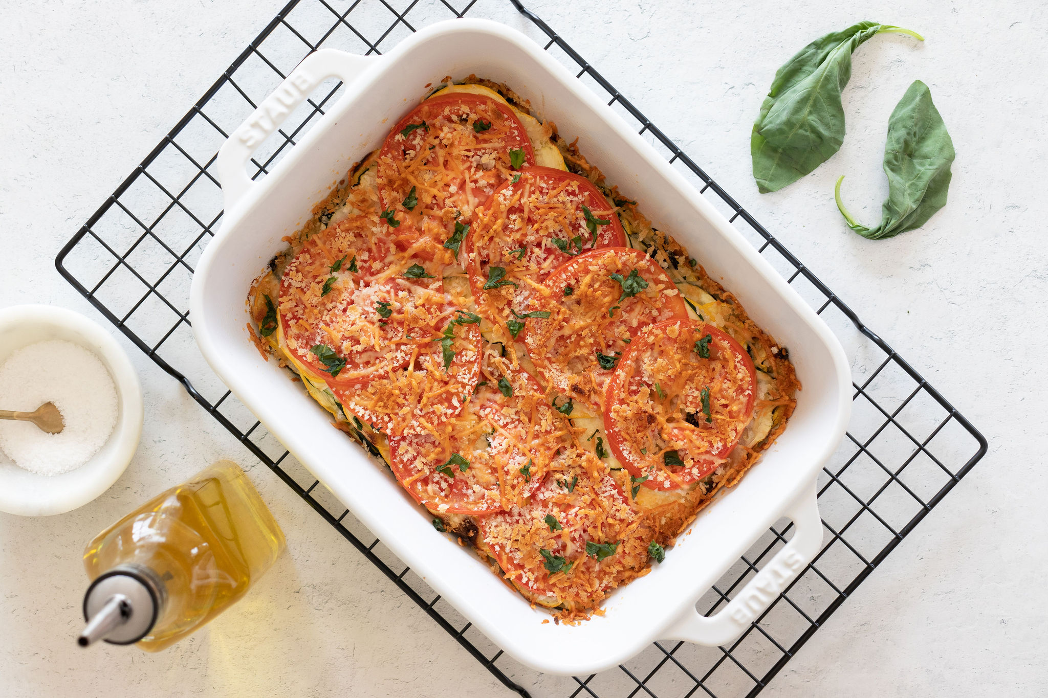 This healthy squash casserole calls for yellow summer squash, zucchini, and juicy tomatoes baked together with layers of breadcrumbs, garlic, basil, and parmesan cheese.