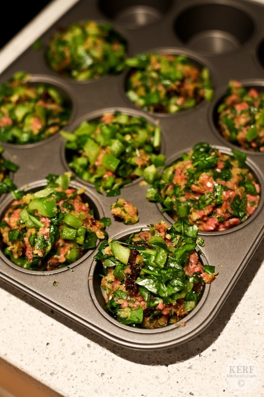 So many of my recipes come together on the spot without much of a plan. I furiously begin writing down ingredients and taking photos. These meatloaf muffins started out as meatballs. But halfway through making them I though it would be nice to have a jumbo meatball. And then I realized that a muffin tin would make the perfect perch for them while they baked. Thus, they went into the oven as meatballs and came out as muffins!