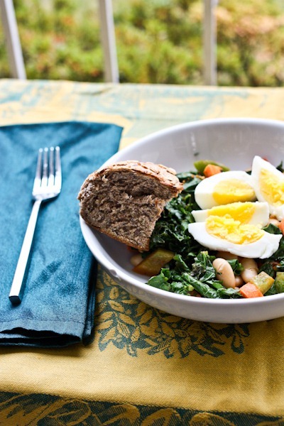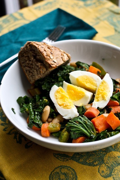 I dressed up in my professional clothes today to go talk about bread to two elementary school classes! I went down to Great Harvest this morning and picked up my supplies and then came home for a quick pre-noon lunch so I could get on my way. I wasn’t terribly hungry yet AND my lettuce had turned brown, so I ended up serving hard-boiled eggs over a kale + bean + veggie sauté.