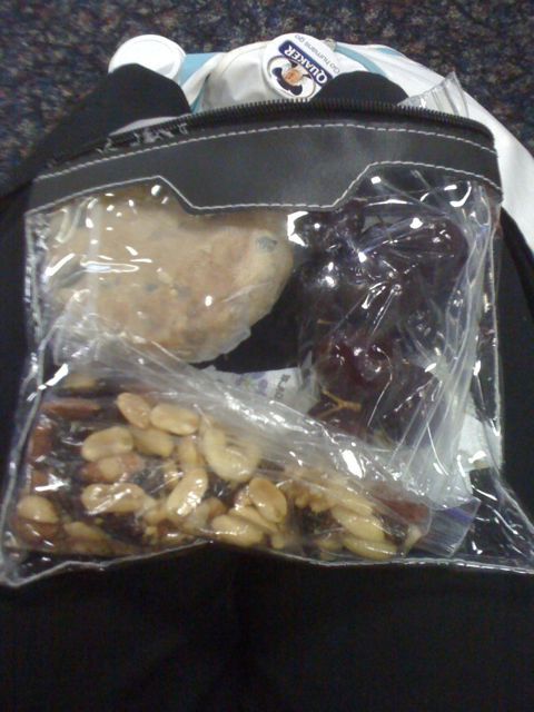 Ive got an Almond Haze and Ginger Rhubarb Dakota sandwich and cherries for the flight. Plus trail mix if I need it. Planning to eat after we take off for a more pleasant dining experience – the coffee will tide me over till then.