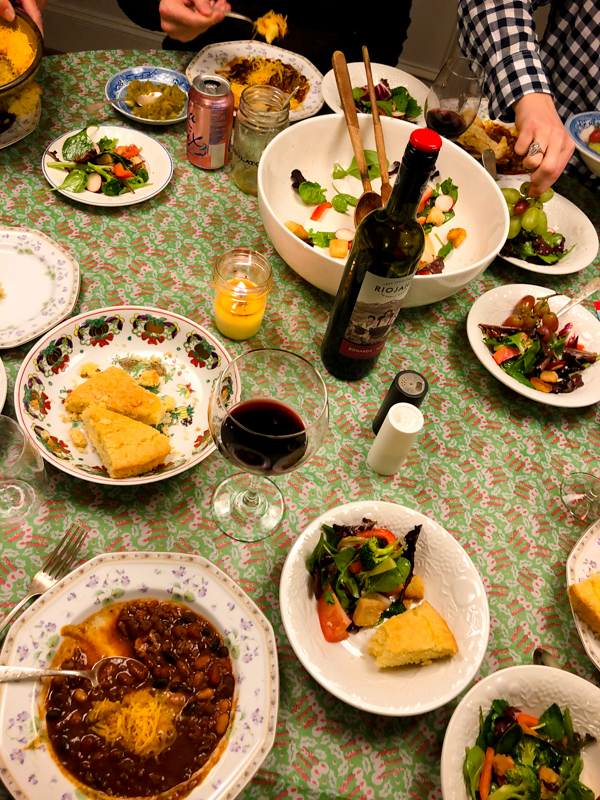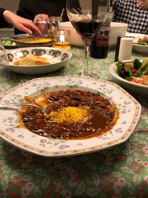 My parents made chili in the slow cooker, with cornbread and salad for dinner.