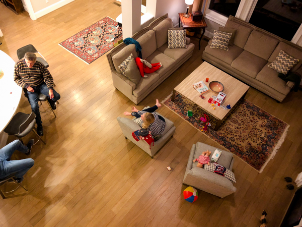 Check out the open floor plan! (Rugs, kitchen tables, etc. all still in progress.)