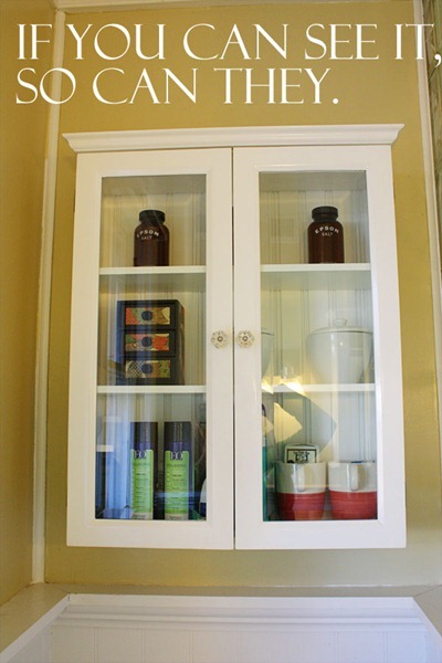 This is the medicine cabinet over the toilet. We all must have some ugly things in our medicine cabinets – bandaids, floss, extra toothbrushes, nail polish remover, extra soaps, rubbing alcohol, pain relievers. Don’t see too much of that do you! [Although I’ll admit that we don’t keep a ton of medicines on hand!]