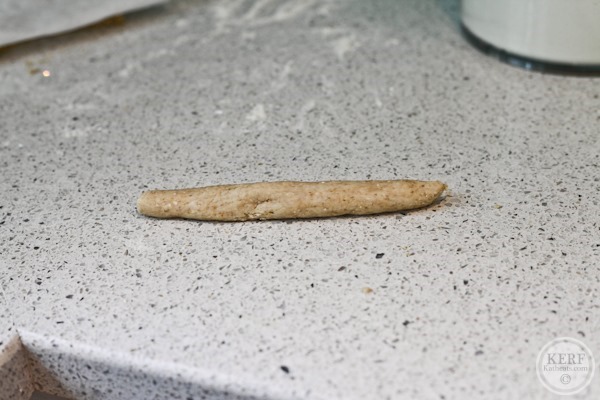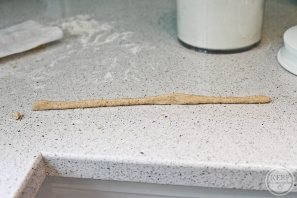 - On a lightly floured surface, working with one section at a time pinch out into a long, thin, round snake, about a foot long.