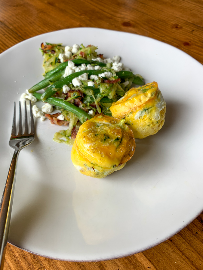 The egg muffins I had several times for breakfast and lunch. First for lunch with extra zucchini + bacon stir fry on the side.