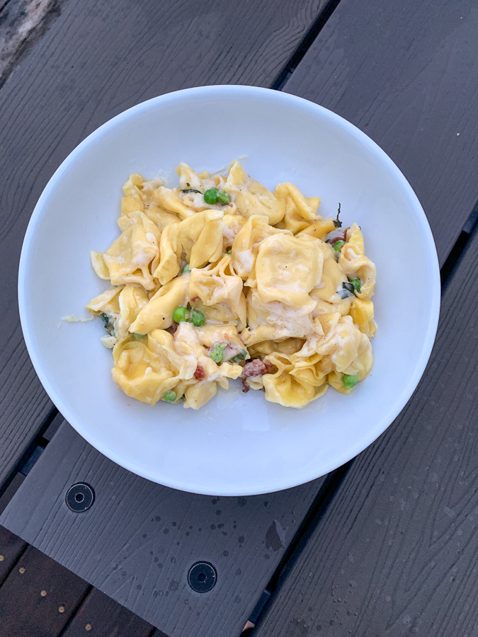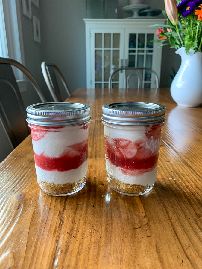 The two entrees I got for mid-week were salmon kebobs with couscous and yogurt sauce, plus a homemade salad. And the most delicious spring tortellini with peas and pancetta! ANNNNDD – two cheesecakes-in-a-jar!! I love that Della is offering some homemade desserts too! (I think I had a hand in that suggestion