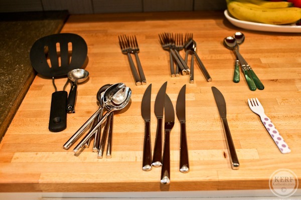 I know I am behind on this one, but I am just catching up on old posts. I make everyone sort their silverware before putting it in the dishwasher. My silverware basket thing has 6 sections so there is room for everything to have its own section, then when I am ready to empty its ready to go into the drawer. My husband has learned the rules fairly quickly, but it can be frustrating when guests want to help by putting dirty dishes in the dishwasher and they mix it all up.