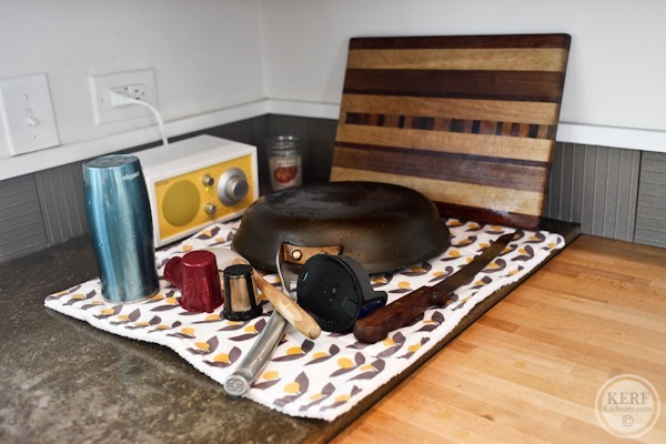 I just use a dishtowel next to the sink to put my hand-washed items and change it every couple of days. I also have to rearrange things when James loads the dishwasher…. and look for the items when he puts them away, but never mind either of those. Because putting away the flatware was my job growing up, it doesn’t bother me to put it away. I pull the knives out first to put in the block, then the utensils, then grab the flatware in bunches and sort as it goes into the drawer. James pulls the whole rack out to take to the drawer.