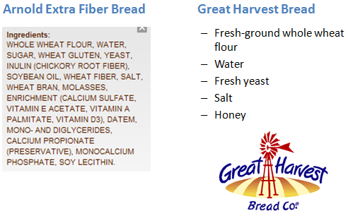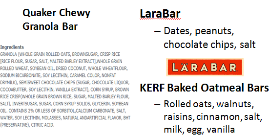 Not all bars, cereals, breads or soups are created equal. Check out the difference between brands of the same “food”. The ones on the left have much longer and processed ingredient lists than the ones on the right.