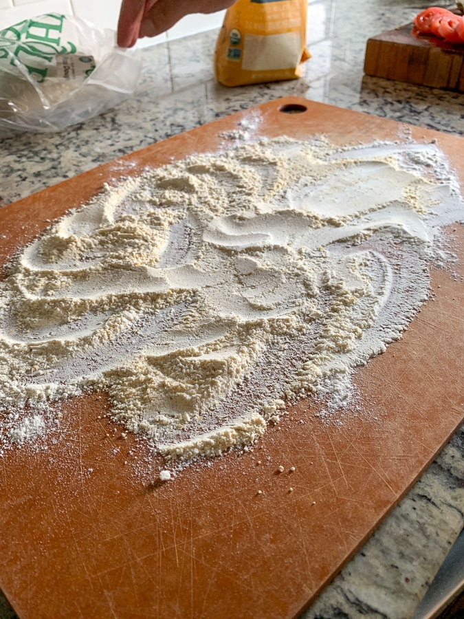 - Cover board with 75% all purpose flour and 25% cornmeal and push and stretch crust out into a big circle, incorporating some of the flour on the board into the dough which will help keep it from sticking to your hands.