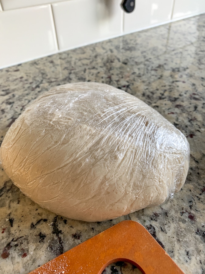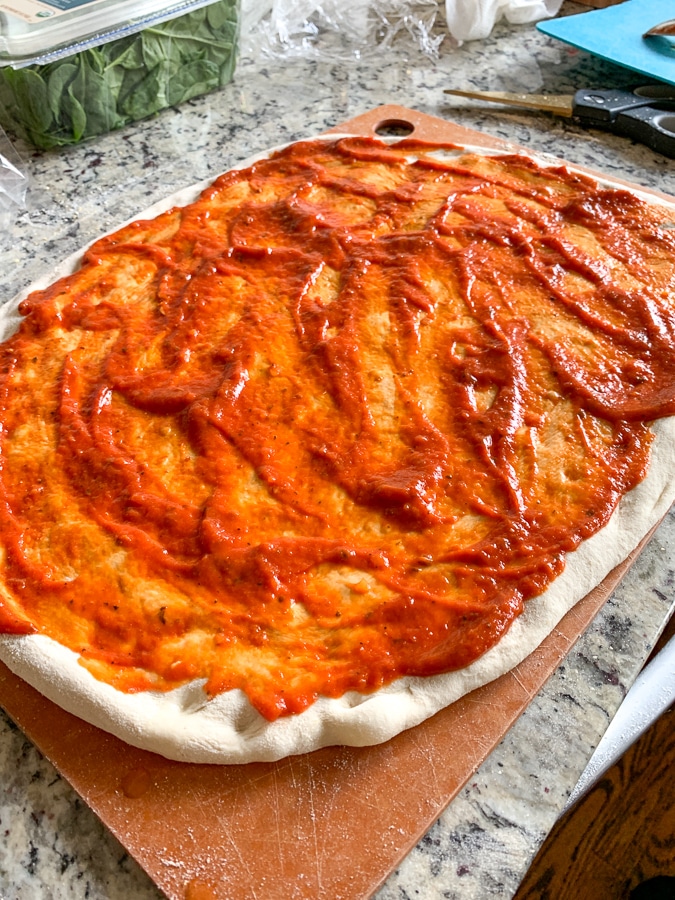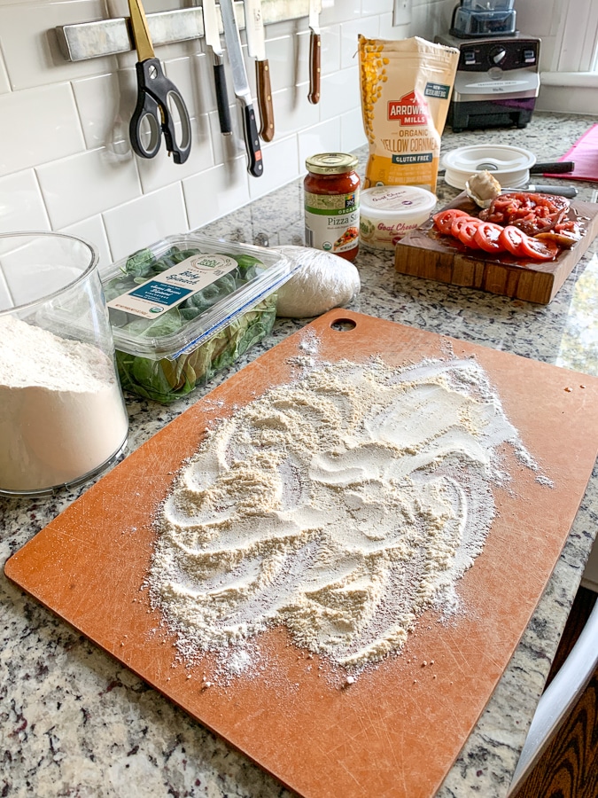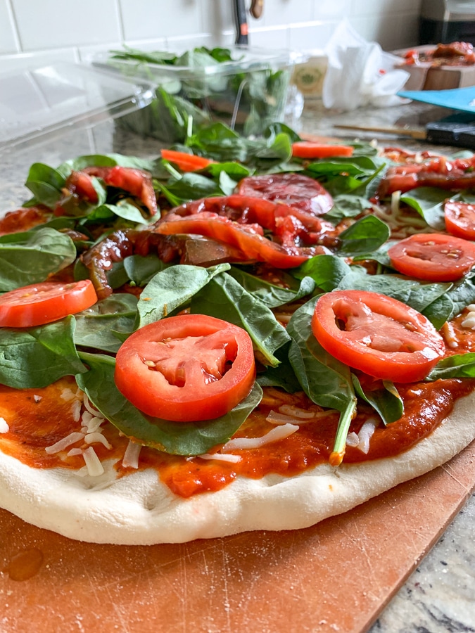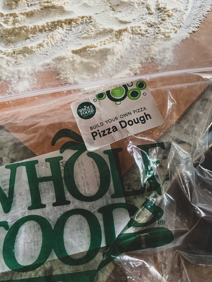 We buy our pizza dough from Whole Foods pre-made. It saves time and is delicious! (You can obviously make it from scratch as well.)