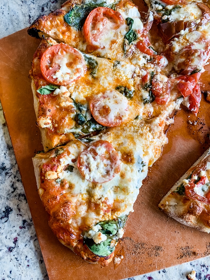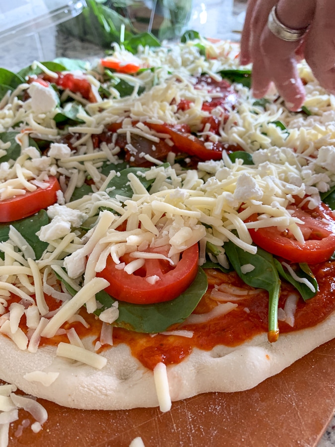 It’s tempting to go overboard with toppings but you don’t want your pizza to sag! Go lighter on the sauce than you think, and spread toppings around so you get sufficient but they are still spaced. Using precooked meats and veggies are recommended since the pizza will likely cook before any raw meats would be done.