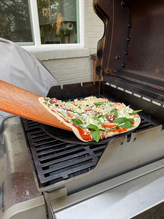 Rolling your dough into a thinner crust works best for grilling because it cooks more quickly and evenly. Aim for the dough to be about ¼-inch thick. (Remember it will rise).