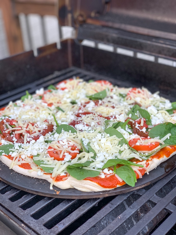 Some people find it easier to precook the dough into a tortilla pliability before adding toppings. If you’d like to do this, slide the rolled-out dough directly on the grill and cook for a few minutes with the lid down until the down side is firm. You can flip it so it’s even on both sides and gets some grill marks.
