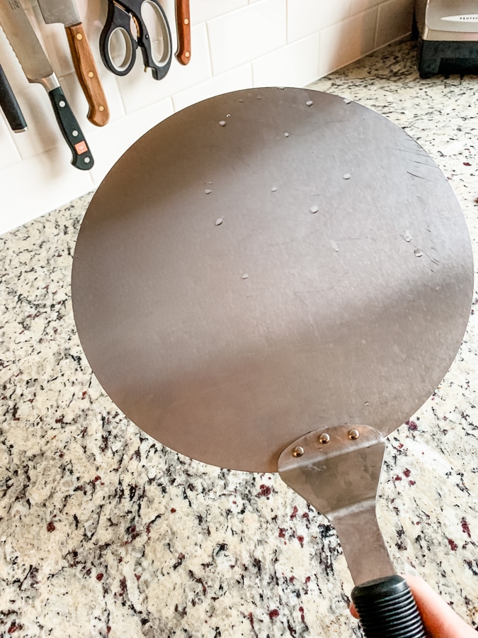 This keeps the dough from sticking when you’re ready to slide the prepared pizza off the board onto the stone.