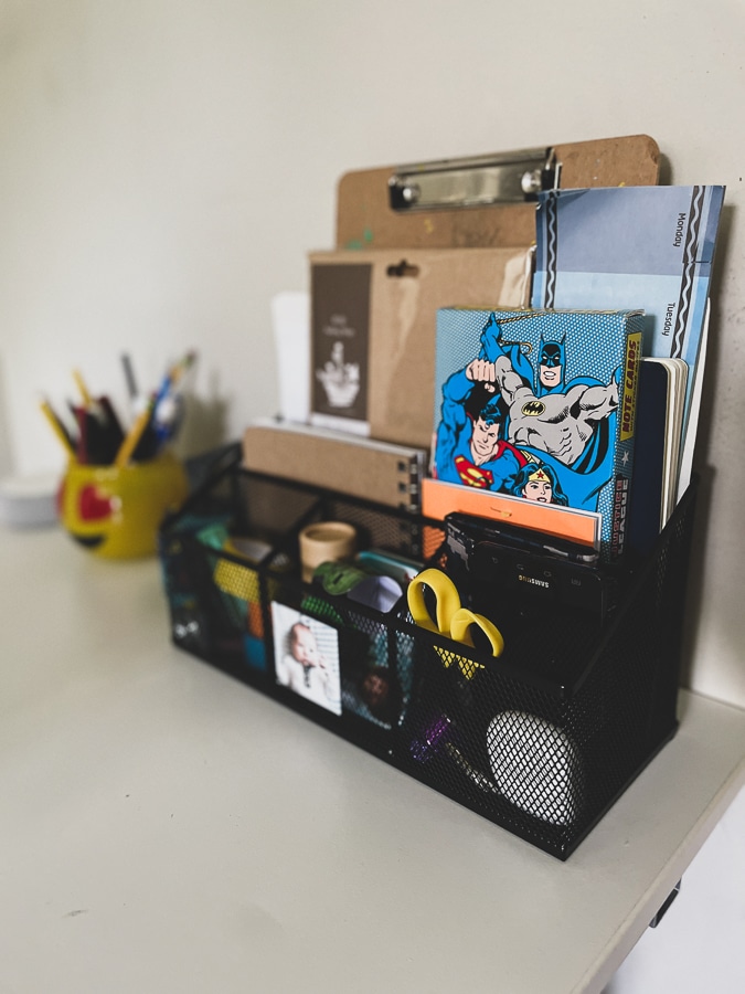 Before I helped Mazen organize his desk we went through each item and removed the ones that were either trash (there was a lot of trash!) or he didn’t need anymore. Also, I love that he has his baby brother on a magnet there <3 Always ask family members for help making these personal decisions – then you won’t have any angry kids when you throw away their favorite keychain or “piece of trash” paper.