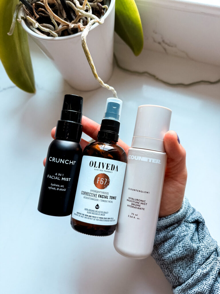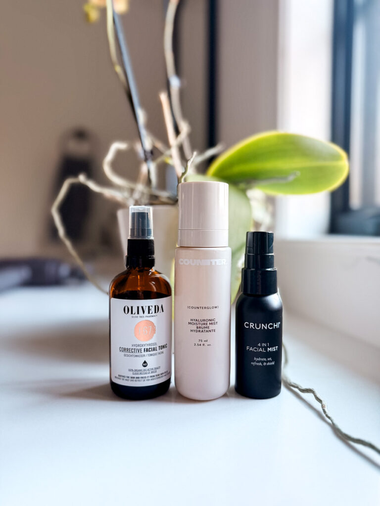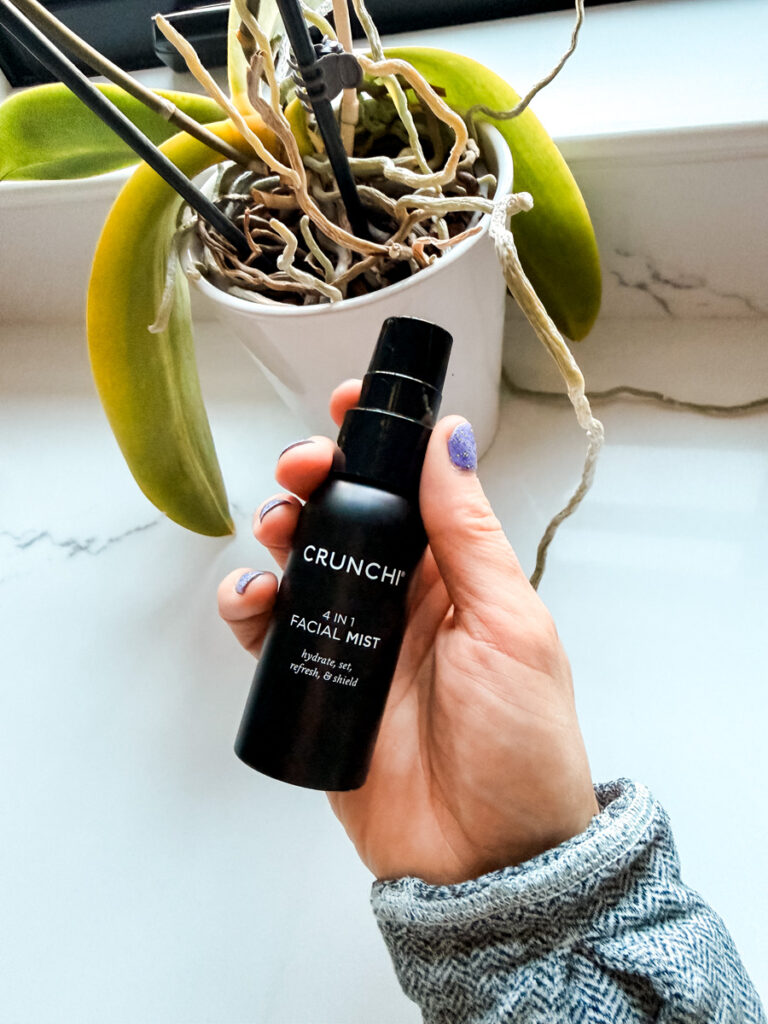 If your skin is extra dry, try layering a light toner twice or use a hydrating mist through the day. Mists are great for a midday refresh without disturbing makeup. Both Counter’s Hyaluronic Mist and the Crunchi mist are great for mid-day hydration boosts.
