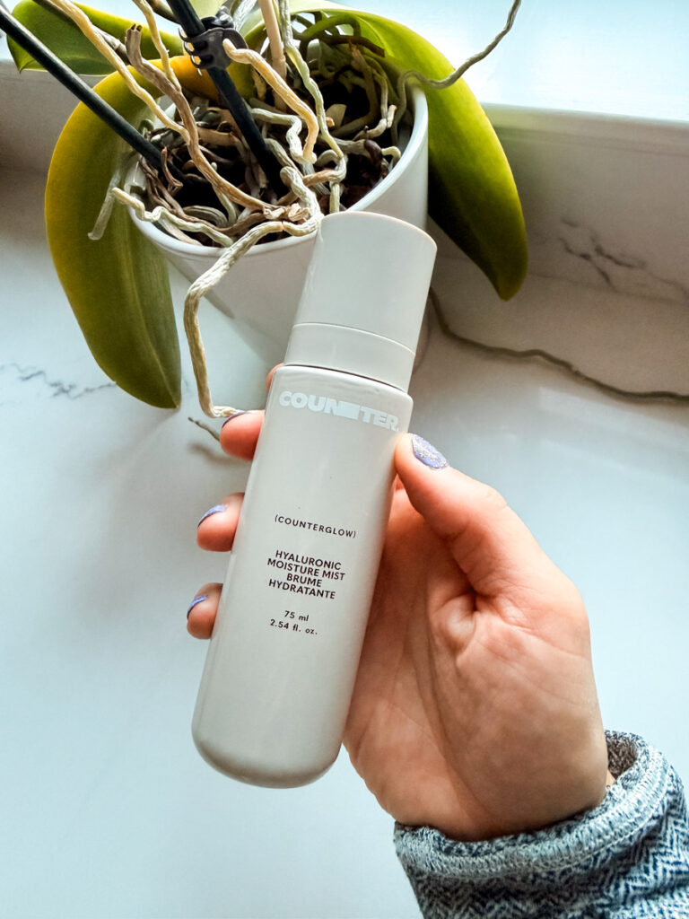 Hydrating toners add immediate moisture — especially helpful for dry skin — and often contain humectants that pull water into the skin. If your skin feels tight after cleansing, I describe it like a little drink of water for the face. It counters that tight feeling. Counter’s Hyaluronic Moisture Mist is a great example of one with ingredients that pull water into the skin.