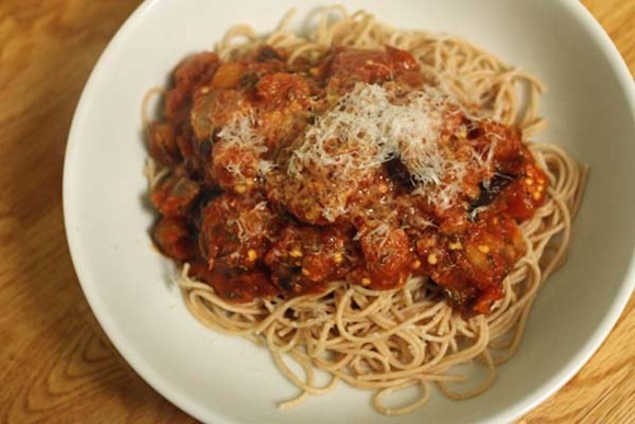 The spaghetti was whole wheat angel hairhair and the sauce was jarred and mixed with sauteed eggplant and mushrooms plus garlic gold oil and basil