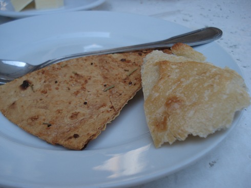 Some delicious crackers (parmesan, flax and rosemary!) plus some good sourdough–ish bread were delivered to the table. I. Love. Bread. I had one more cracker after this 😳