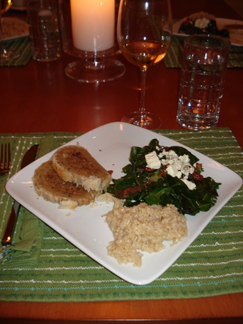 Karen cooked this vegan loaf that she LOVES from EarthFare. It comes pre-made and is a base of wheat gluten coated in puff pastry and stuffed with a sausage-like mixture of hazelnuts and spices. You just bake it for 45 minutes or so until it browns on the outside (no recipe b/c it was pre-made).