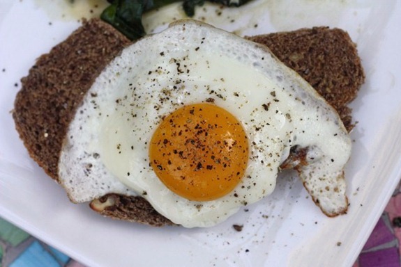 A sunny-side-up fried egg over two small slices of Great Harvest Flax Oat Bran (sooo doughy!)