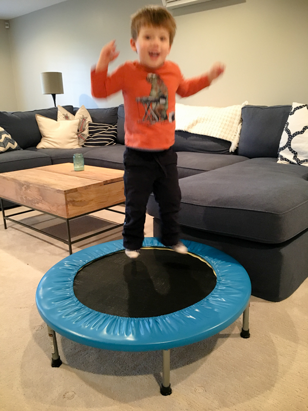 This trampoline was a gift from a friend, and we only use it on rainy days mostly because it gets forgotten about until then. This is a GREAT way for him to burn off some energy! (And me too!)