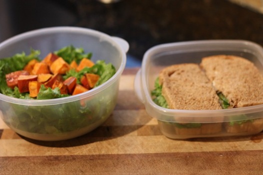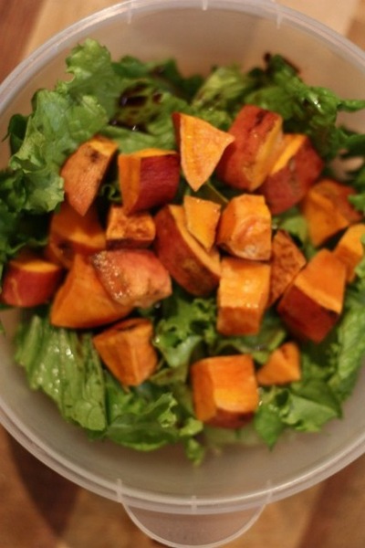 And a simple salad with balsamic (drizzled it at 11AM and lettuce was still fine at 5PM) with leftover microwaved cinnamon sweet potato