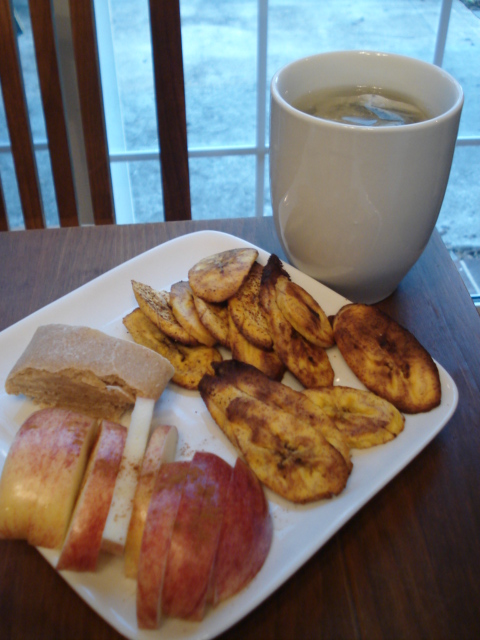 And here’s what I DID have: ~ 1 oz of toasted bread, plantain chips (cut ripe plantains into slices, spray with cooking spray, sprinkle with spicy spices – whatever you like – and bake at 400* until crisp) and a small apple with hot tea. About 230 kcal –