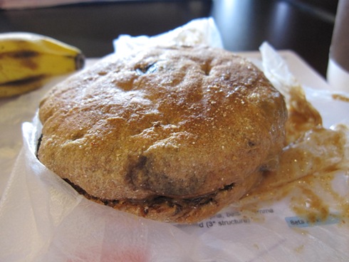 I debated eating cereal or oatmeal (what I really wanted) but I knew I’d have to wolf it down and hate not being able to enjoy a meal! So I decided on a GH Cinnamon Raisin Bun with Almond Butter! Hidden in between were 3 walnut halves and a drizzle of honey as well. I toasted the bun, so the AB kind of melted on my way there 🙁
